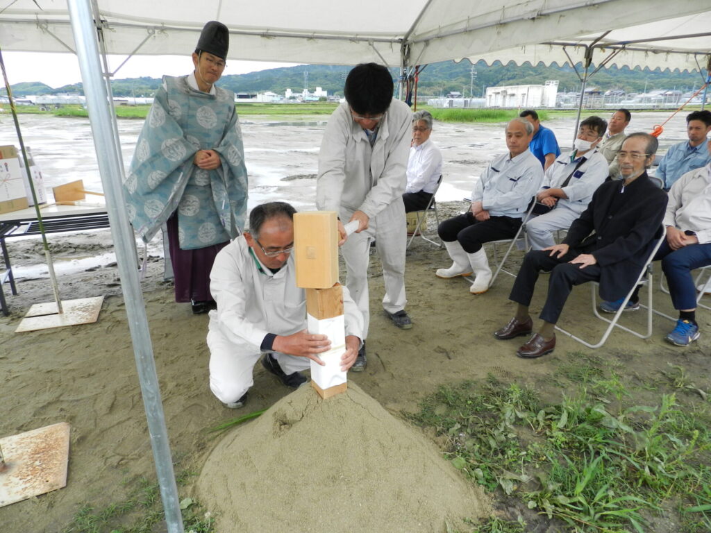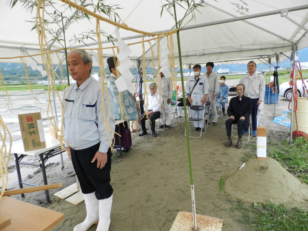 これに先立ち、造成工事並びに11号・12号倉庫新築工事の地鎮祭を執り行い、工事中の安全と無事完成を祈願致しました。