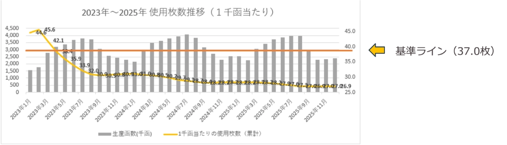 ①製造1千箱あたりの使用枚数削減